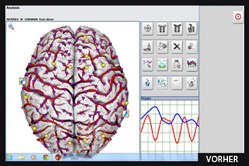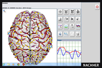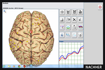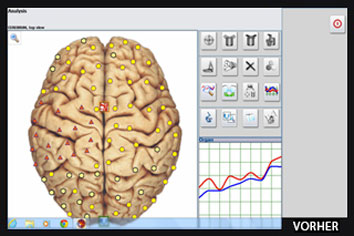 Drei Metatherapie-Sitzungen haben zu einer positiven Veränderung geführt: Die energetische Überaktivität des Gehirnlappens ist fast vollständig verschwunden. Auf der Grafik ist jetzt eine Kurve zu erkennen, die sehr nahe bei den gewünschten Standardwerten liegt; zudem konnte die betroffene Person eindeutig eine Verbesserung feststellen.